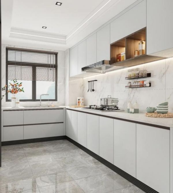 由于厨房多油烟,橱柜大部分都不会做留空设计,以免油烟侵入,难以清洁。但是有的也会在抽油烟机两边的吊柜留出1~2个小开放格,放置台面、墙面放不下的调味品或其它餐厨用品,伸手即拿,更方便烹饪。