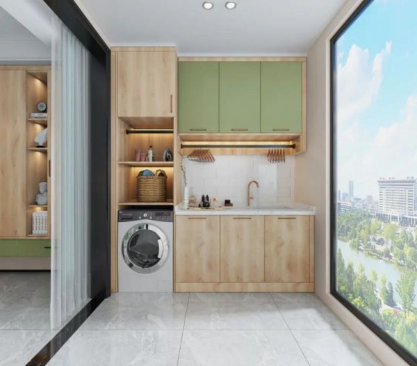 阳台柜常被设计为生活柜,开放格一般都会在中部留空,用来放置晾衣架、洗衣液、毛巾等物品。有的还加设洗手盆,以便随手清洗小物,洗晾更方便。