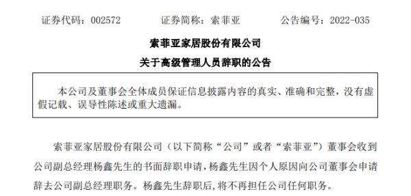 7月8日,索菲亚(002572.SZ)发布关于高级管理人员辞职的公告,公司收到副总经理杨鑫先生的书面辞职申请,杨鑫因个人原因向公司董事会申请辞去公司副总经理职务,其辞职后,将不再担任公司任何职务。