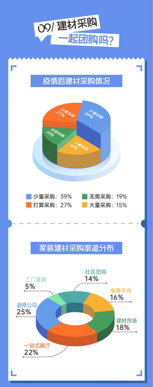 此外,报告还提到,翻新、局改等家装需求多点迸发的后疫情时代,后端家居建材市场正在迅速复苏,值得关注的是疫情让用户的消费观念回归理智,报复性消费行为仍是少数,疫情期间养成的团购习惯也应用在了建材采购方面,建材团购已成为家装用户建材采购的新方式。采购品类方面,环保无醛类建材、家具及水源、空气过滤净化类仪器需求激增,由此可见疫情后人们对于家居环境的环保意识逐步提高,健康环保将成为家装企业与家具品牌商产品结构调整的重要导向。