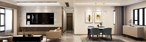 开放式的客厅空间,休闲区与用餐区相通,独特的洄流动线张弛有度;装饰设计注重留白与呼应,吊顶、灯光、大理石墙饰、地毯,构成了整体的层次美感,将自由与舒适尽情呈现。
