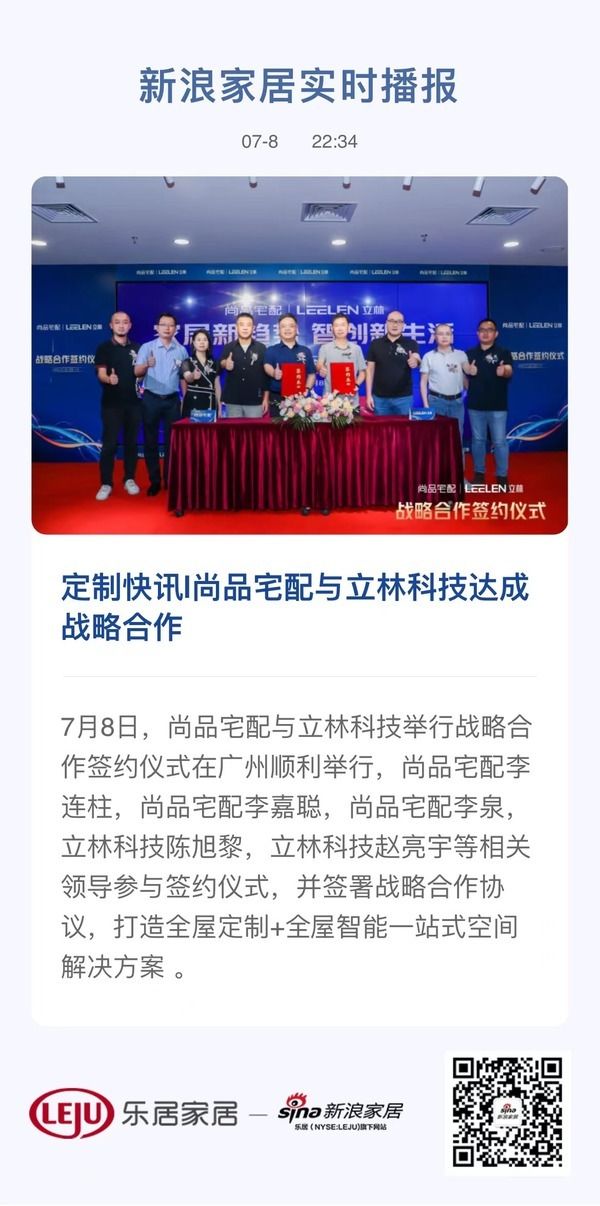 新浪定制频道讯 7月8日,尚品宅配与立林科技举行战略合作签约仪式在广州顺利举行,尚品宅配集团董事长李连柱,尚品宅配集团副总裁、尚品宅配总经理李嘉聪,尚品宅配集团总裁助理、集团数智中心总监李泉,立林科技董事长陈旭黎,立林科技体验馆事业部总经理赵亮宇等相关领导参与签约仪式,并签署战略合作协议,打造全屋定制+全屋智能一站式空间解决方案 。