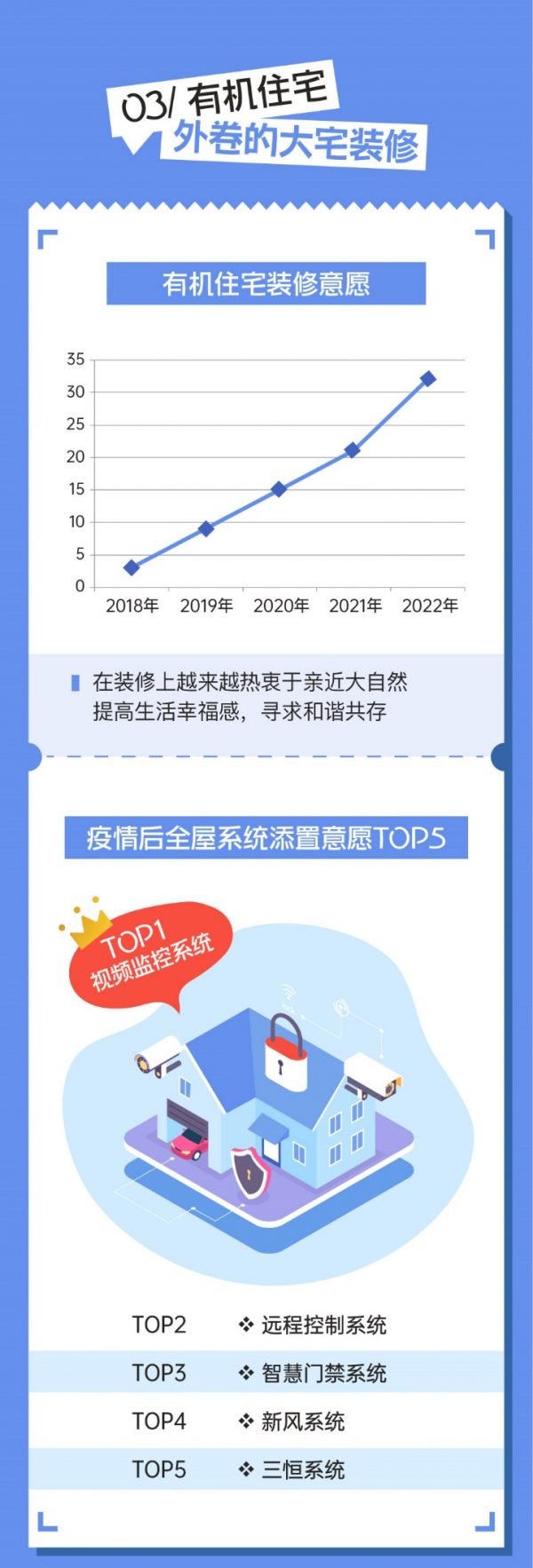 《报告》显示,疫情后人们对于房屋的功能性、舒适度等方面越发重视,有近六成的用户有改善居住环境的意愿,其中又有近半用户倾向于更加成本低、周期短的局部装修。同时,新房置换方面经济性不再是用户关注的重点,完美结合节能环保建筑技术和自然元素的有机住宅正在成为住宅市场未来的主要趋势,而视频监控、远程控制等入门级全屋系统在房屋改善环境中得到了广泛应用。