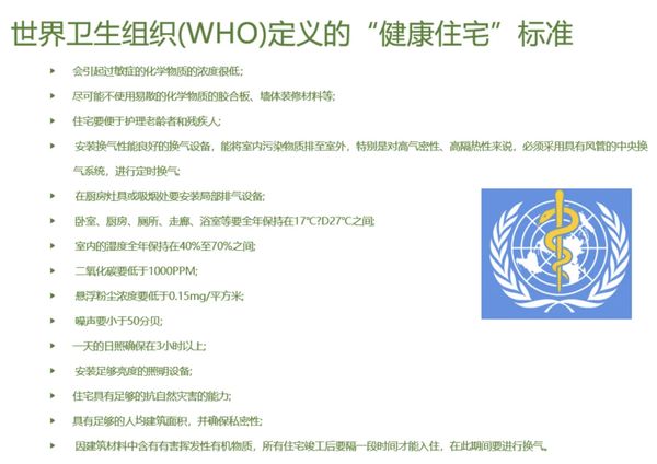舒适家居系统作为集合了中央空调系统、中央供暖系统、中央新风系统、中央除尘系统、中央水处理系统、中央热水系统、太阳能、空气能、智能家居等系统,符合世界卫生组织WHO关于健康住宅标准15项要求。简而言之,舒适家居系统可以被视为现代国际科学健康住宅的标准配置之一。