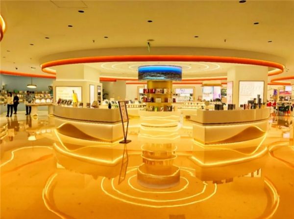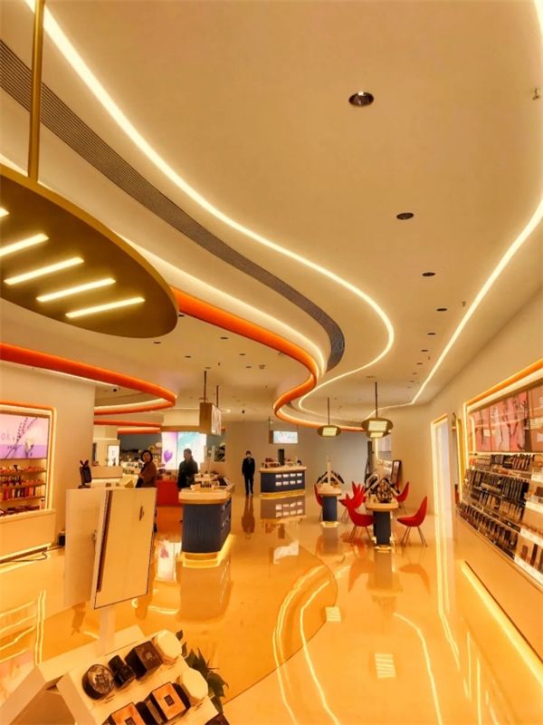 在商场内部空间设计,美谷美购广场使用圆润统一的流动感设计给人的视觉感受更加柔和。作为一个售卖美妆的广场,更多的受众是女性这样的风格也很符合女性的柔美特性