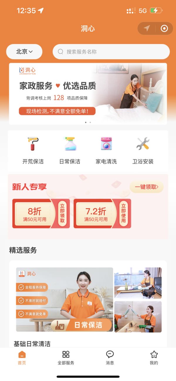 北京商报记者在洞心平台看到,以温暖的橙色为主色调的界面中,员工身着橙色制服,微笑着面对每一位客户。大从开荒保洁、日常清理,小到家电清理、卫浴安装、收纳规划、地毯洗护,在洞心都能找到对应的服务。