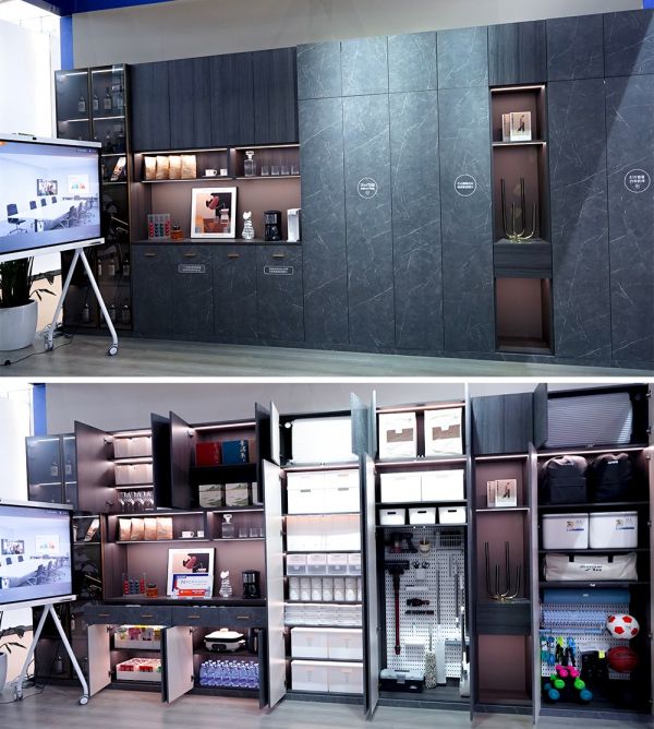 “小美管家”正是美尼美打造的三大服务IP之一,不仅仪表出众,更是美好生活改造专家。小美管家主要通过空间诊断、空间规划、生活方式打造等专业化服务解决用户家居痛点,增加品牌美誉度与口碑传播。美尼美展位现场还有小美管家收纳柜展示,整体布局严丝合缝,可按需定制,高颜实用,满足客户不同的收纳需求。