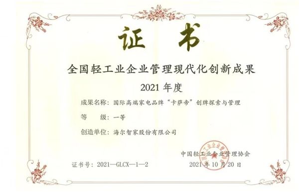 高端份额第一之后,卡萨帝又获管理创新一等奖