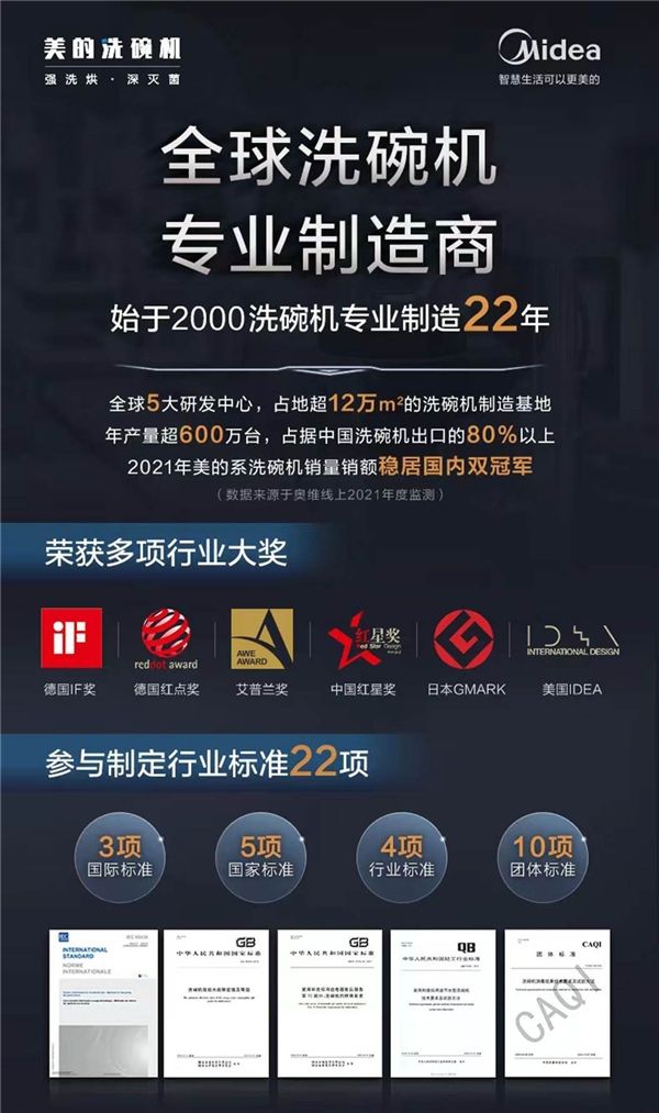 据公开资料显示,位于顺德的美的洗消工厂占地面积12.3万㎡,年产能合计达640万台,产销规模居亚洲第一,全球第二。截至目前,美的洗碗机已拥有15个国家级实验室,先后开发了1000多款通过全球多个权威认证机构认证的明星单品,参与洗碗机行业标准制定22项。