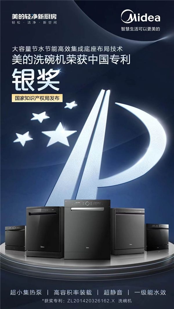 具体到洗碗机领域,美的在全球布局专利超3000项,有效专利达到2000余项,其中国内发明专利428项,实用新型专利1369项,外观专利339项,海外专利145项。多项相关专利技术中,其中热风干燥技术专利曾获得第六届广东省专利金奖,底座布局技术专利获得第二十三届中国专利银奖。
