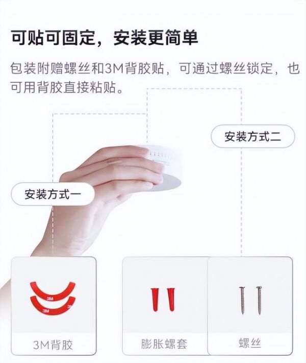 凯得MOON智能燃气报警器 WIFI版可通过背胶粘贴、螺丝固定等方式进行固定安装。随包装附赠螺丝和3M背胶贴。