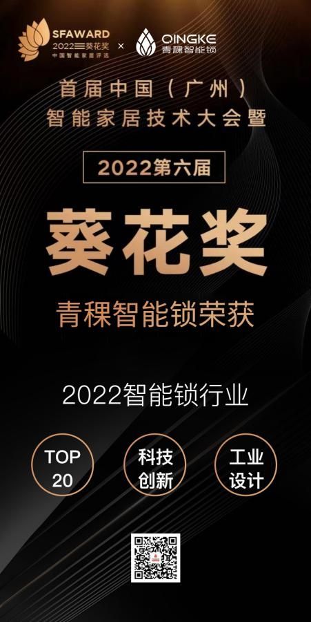青稞智能锁凭借自身的创新实力、设计实力和研发实力在众多参选品牌中脱颖而出,一举斩获“2022智能锁行业科技创新产品奖”、“2022智能锁行业工业设计产品奖”、“2022智能锁行业TOP20”三项奖项。