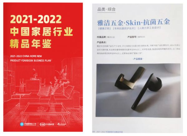 在广州建博会期间,雅洁五金再获殊荣,而作为雅洁产品生态矩阵系统中的翘楚,经过产品、品牌、行业、口碑四个维度的综合评审,Skin·抗菌五金HP8110入选《2021-2022中国家居行业精品年鉴》,该年鉴旨在打造全面涵盖家居精品的档案库、研究行业发展变迁的资料库,为企业研创提供专业指南,是大家居建装业权威工具书。