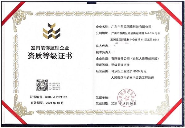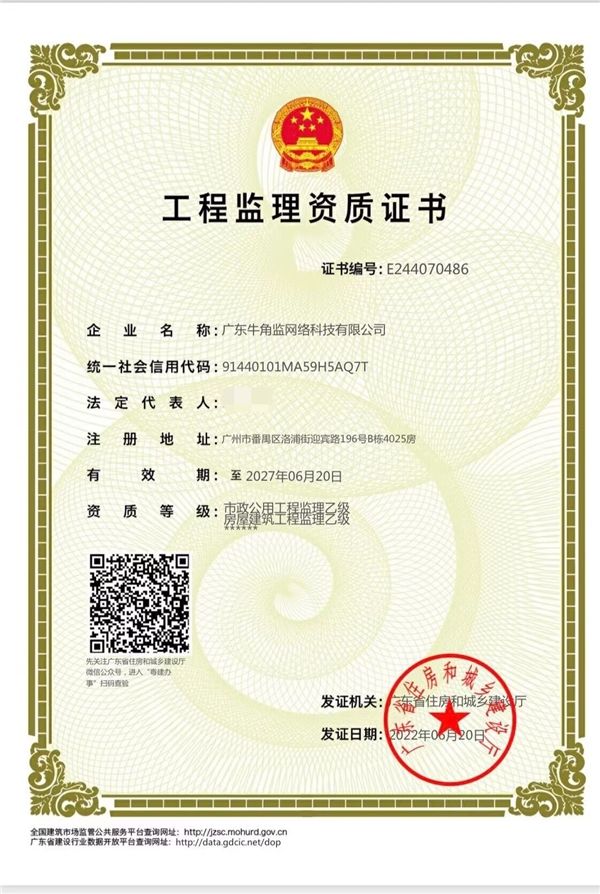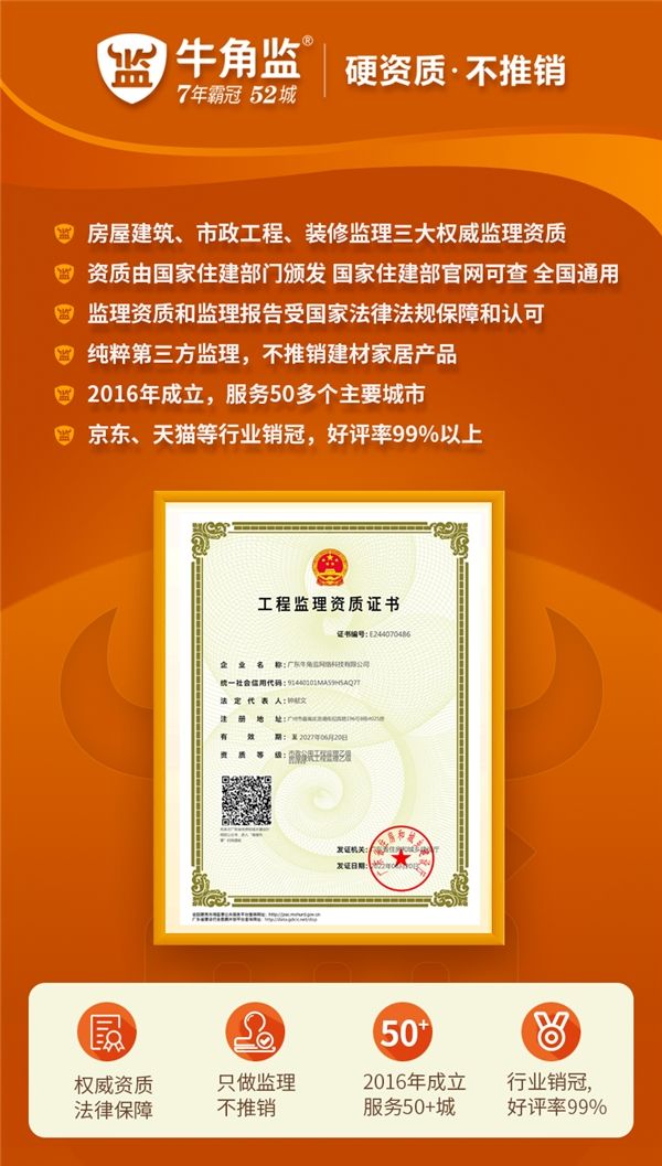 牛角监继获得“全国装修装饰甲级监理资质”后,再获国家住建部门颁发的,在中华人民共和国城乡和住房建设部官方网站公告的“全国房屋建筑工程乙级监理”、“全国市政公用工程乙级监理”双项监理资质,在装修监理行业拥有三大齐全资质、受到国家相关法律法规保障和认可的权威装修监理企业,除了牛角监,别无他家。