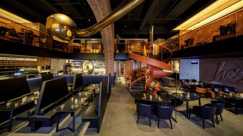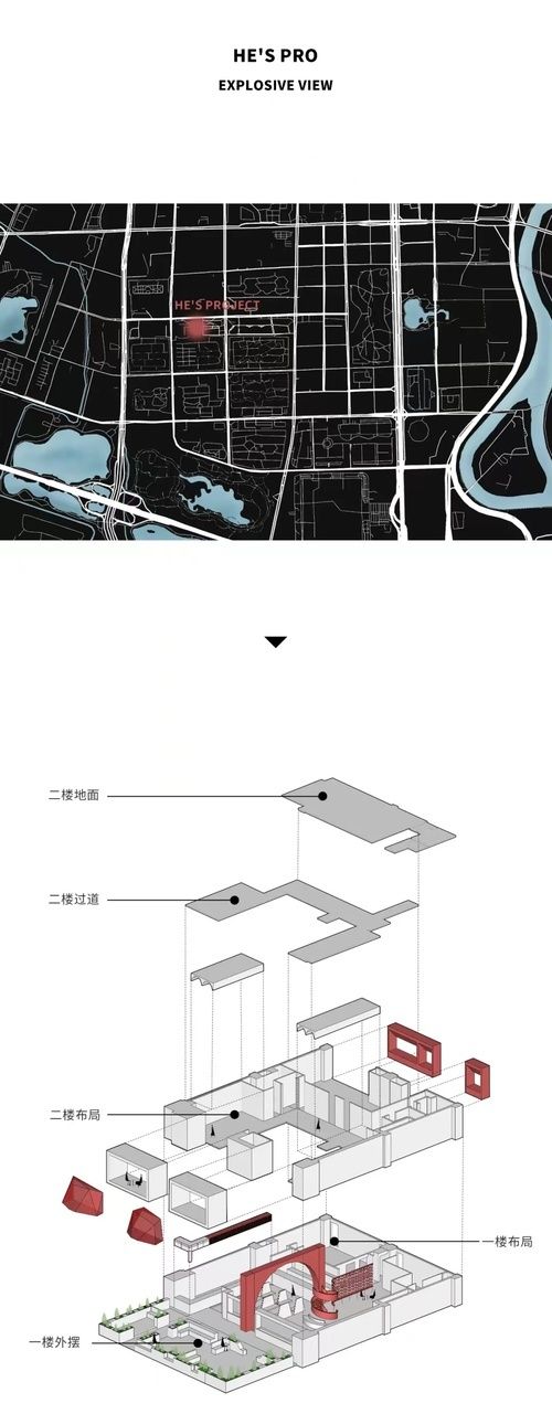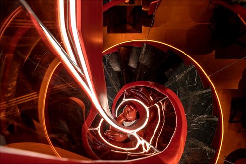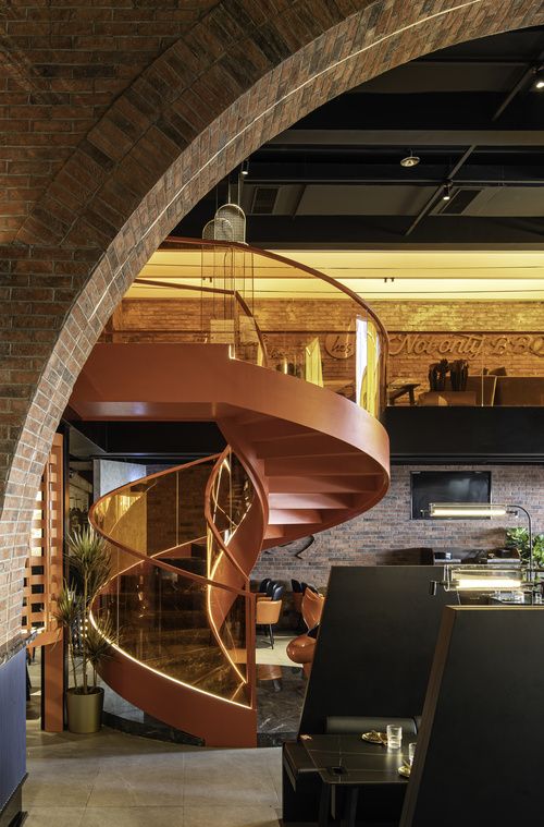 区别于传统的重餐饮设计,FUSION DESIGN为整个空间打造了一座视觉焦点。它连接二楼,连通一楼,让来此就餐的客人在上楼见面的过程中增添了几份仪式感,又或者是给内心的紧张情绪提供了一个体面的理由。从此何师烧烤有了自己的空间记忆点,整个空间的视觉张力得到强化。