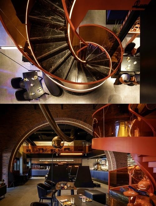 整个空间分为上下两层,一楼区域,拱形的砖石结构将空间一分为二,大面积砖石的运用,给精致的空间平添了几份粗粝感,它既是对市井气息的延续,也是对空间特质的独特表达。结合创新我们在空中加入了金属装置,这样的设计手法拓展了空间的边界,预示着人际关系可以在这里无限延伸。不同的人将在此产生不同的空间感受。