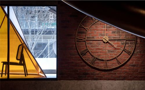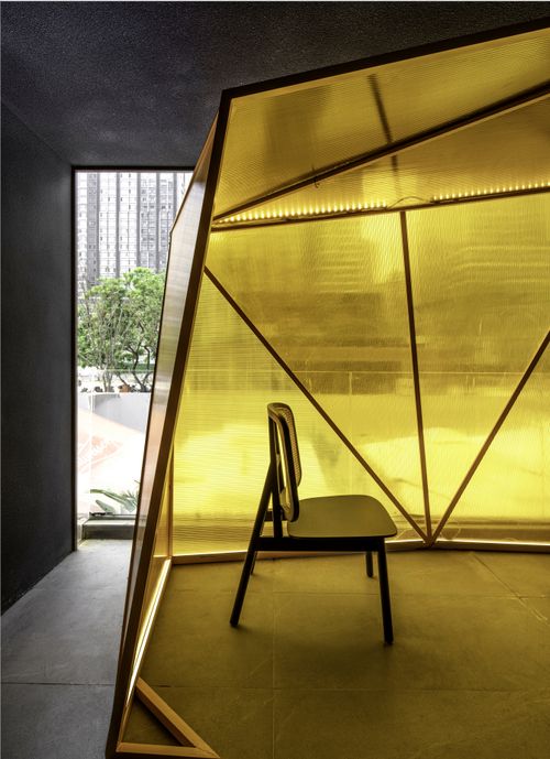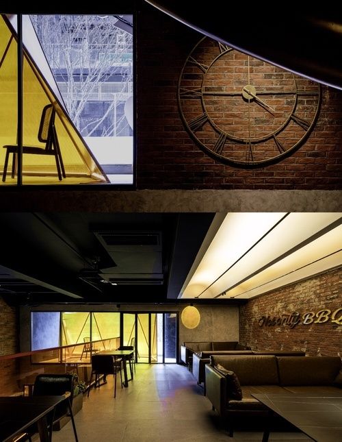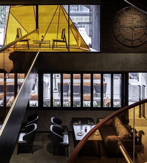 二楼和一楼的散座区有所不同,按照中国人聚餐传统习惯我们设置了包间,保留了外部的散座,形成了包围式的开阔区域。从二楼鸟瞰一楼,视觉及佳。阳光房的设计也是本次的一个亮点,为需要抽烟、拍照、独处的客人提供了一个安全又舒适的绝佳场地。这块区域从楼下望去就是两块巨大的橙色几何异形,它用亚克力阳光板打造,代表了两块烧红的炭石。新兴的工艺材料,通过跳跃的颜色,来追忆传统的炭火烧烤,再度强调了“传统与创新”的设计主题。我们在整体的异形造型下,又通过橙色的玻璃、红砖的孔洞、空心玻璃砖等异于常规的设计,营造出另一种光影秩序,将何师求新求变的诉求再度展现。