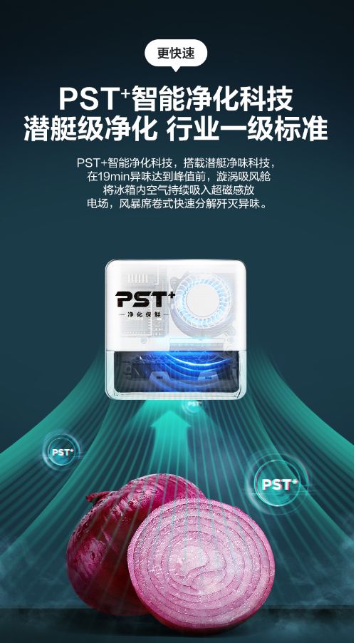 在诸多的冰箱净化科技中,美的冰箱的“PST+智能净化科技”达到了行业一级标准,是值得称道的标杆科技。该技术通过电场升级和高活性金属催化,释放百万级超磁感电解离子,对冰箱内的微环境进行高效的净化消杀;搭载新式涡轮电机,快速换新风,净化更彻底。在19分钟异味达到峰值之前就能歼灭异味和病菌,有效防止食物污染,保证食物保鲜健康。