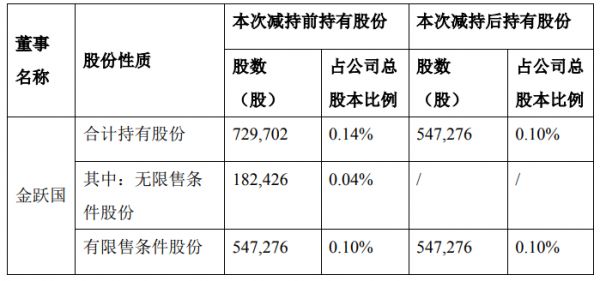 截止2022年7月12日,金跃国通过集中竞价方式减持182,426股,占公司总股本的0.04%,本次股份减持计划完成。本次减持后持有股份547,276股,占公司总股本的0.10%。