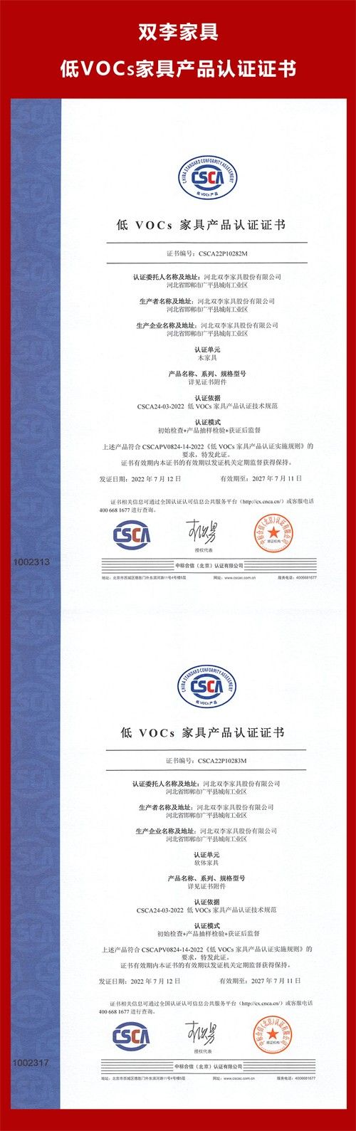 一直以来,双李家具在绿色产品生产和使用方面围绕“绿色设计、绿色生产、绿色家居”的理念,建立完善的环境、能源和职业健康安全管理体系,将绿色、环保、节能等可持续思想融入管理的各个方面,并努力在节能、降耗、减污、健康环保方面等持续改进。2022年7月12日,双李家具同时获得《家具有害物质限量认证证书》、《中国绿色产品认证证书》、《低VOCS家具产品认证证书》三大权威认证,将实木家具产品的综合性能和环保健康标准做到了极致。