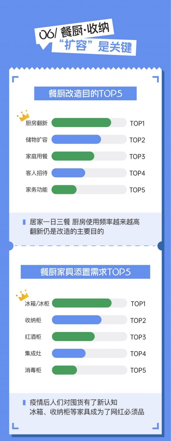 餐厨空间改造的目的来看,翻新仍是改造的主要原因,餐厨空间受日常油污影响较大,一直是家居空间中翻新频次较高的空间之一。除了用餐等日常功能,我们发现疫情后人们对食物、物资的需求越发重视,餐厨家具添置需求的数据也反映出这一规律。冰箱、收纳柜等家具成为餐厨空间内炙手可热的网红产品,更有用户一口气装了一排冰箱,以丰富的物资储备增强宅家安全感。
