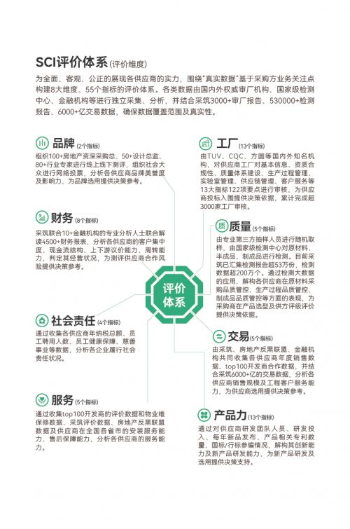 SCI评价资料真实。测评资料来自房地产商、设计院、建筑单位、检测机构、金融机构、供应商、第三方数据平台等渠道,覆盖整个产业链。