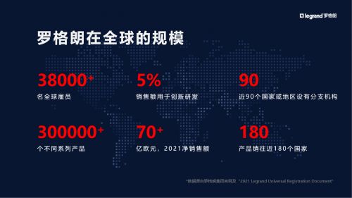 罗格朗是全球建筑电气行业专家,成立于1865年,在近90个国家或地区设有分支机构,产品销往近180个国家或地区,拥有超过38000名雇员。旗下经营了近70个商业品牌,拥有超过3500项工业专利、300,000个不同系列产品,包括开关插座、综合布线、智能系统、楼宇对讲、低压电器、智慧养老等,广泛应用于全球许多著名建筑,如法国罗浮宫、美国五角大楼、迪拜帆船酒店、北京雄安高铁站、北京大兴国际机场、上海迪士尼等。作为一家法国的上市公司,其股票被法国CAC40指数选为计算对象之一。