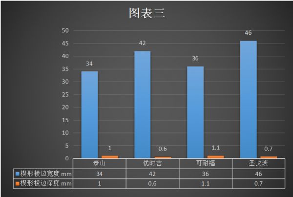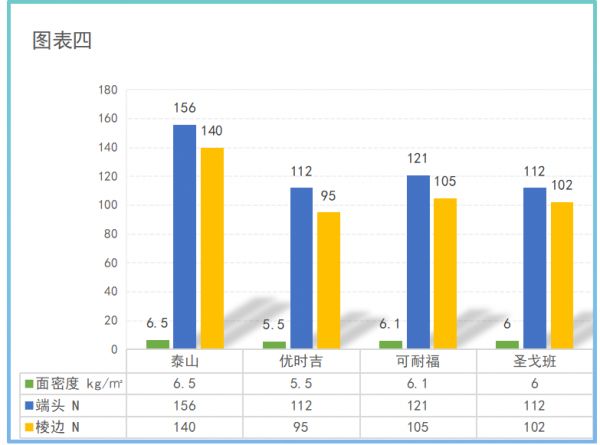 在图表四中,除优时吉低于6kg/m²以外,泰山、可耐福、圣戈班的面密度均在6kg/m²以上,其中泰山为6.5kg/m²是四个品牌中面密度最高的,其端头与棱边的硬度数值也最高。