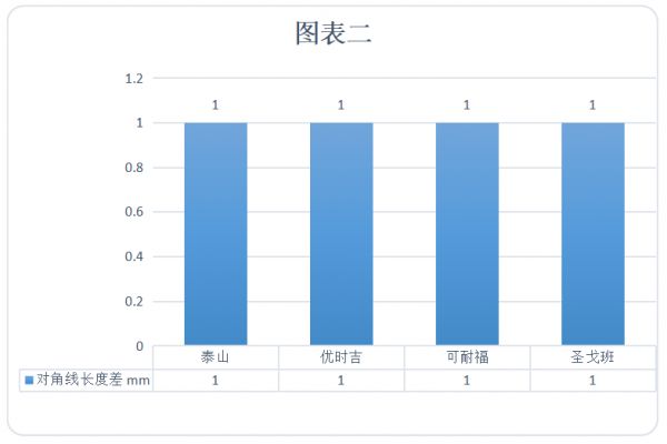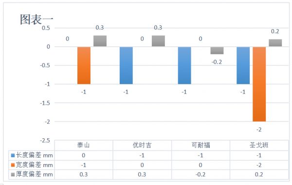 从外观质量和尺寸偏差的检测数据来看,四个品牌均符合国标要求。如图表一所示,在长度偏差中,泰山数值保持在0mm,可耐福、优时吉、圣戈班数值为-1mm;宽度偏差全部合格,优时吉、可耐福的数值为0mm,泰山、圣戈班分别为-1mm、-2mm。
