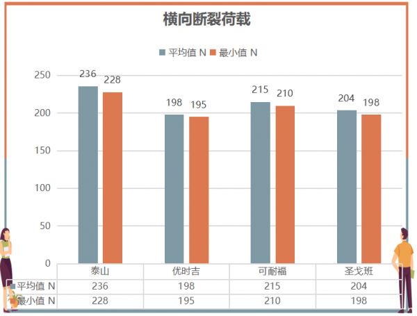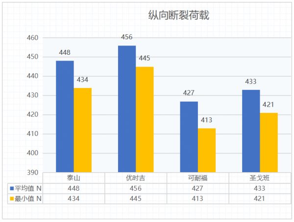 在纵向断裂荷载和横向断裂荷载的图表中,详细列举了四个品牌纸面石膏板横向与纵向断裂荷载平均值与最小值。关于断裂荷载影响因素,在多次检测解读中均有解释,这里不再赘述,具体数值可以参照图例。