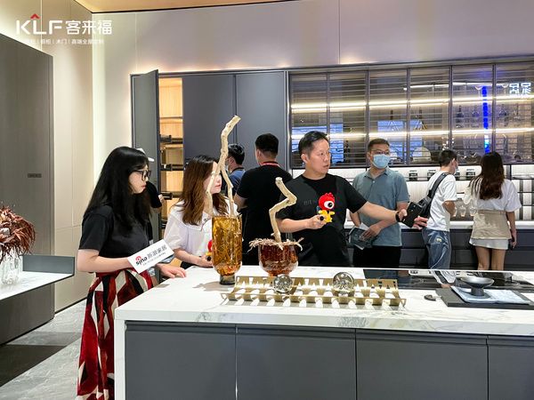 尹其宏:客来福在此次展会、也是在行业内,首次重磅推出水漆实木系列产品。最值得一提的是“天琛”系列色板的水漆半透工艺。从制作工艺上讲,采用了目前行业内最领先的半透工艺——“见木不见漆”,木饰面与肤感PET的结合橱柜。从水漆入手,水底水面,采用实木材质,看得到木皮但看不到油漆,近看可以清晰看出木纹通透的纹理感;0度肤感的触觉,体验进一步升级了产品的质感。半透工艺主要针对进口原木,用精湛的工艺把木材各式各样原生态的纹理展示出来,达到最自然的状态,非常考验技术。