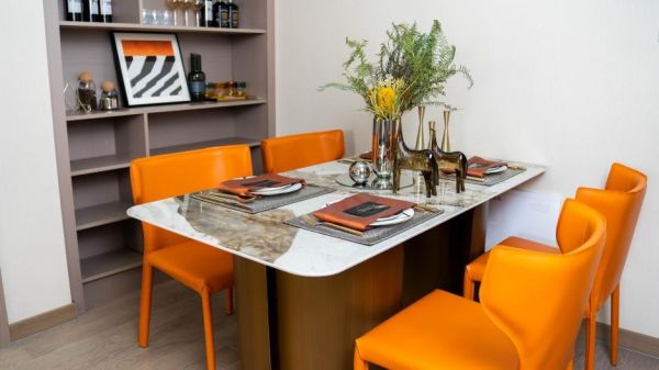 设计师采用L型橱柜、一桌四椅,打造出了实用餐厨空间。他们为厨房配备了L型厨房台面烟机灶具,合理利用了空间,打造出流畅的使用动线。餐厅部分配备了1桌4椅、餐边柜,餐桌为整块岩板打造,纤薄身材高硬度,有颜值的实力派!餐边柜我们可以放置小家电、杯碟器皿、零食酒水、杂物,增加了餐厅的功能性!