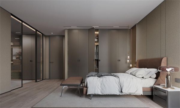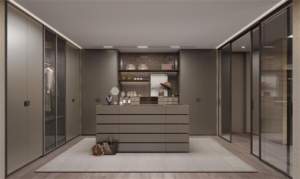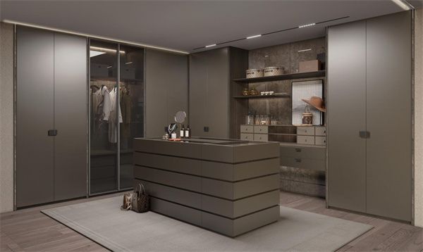 在S系·摩尔衣帽间空间里,SCHMIDT司米家居为其搭配了超纤皮革、岩石肌理黑金石拉手及金属质感家居装饰,随后辅以灯光营造氛围,完美凝练出沉稳格调,突显极具雅致品味、个性化与高品质的空间特点。