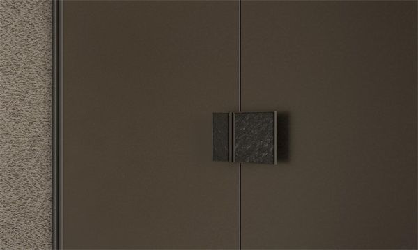 S系·摩尔配有独特黑金石拉手,四周采用枪灰哑光的金属边框,内部嵌入了天然岩石肌理效果的岩板,闪耀着天然石材光泽,与门板背板材料的光泽感交相呼应,在细节中点缀空间高定感。