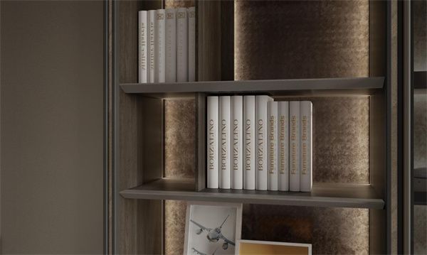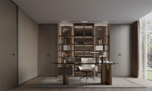 书柜的意式发光搁板,以其意式极简工艺点缀出空间的高级感,给予高定的视觉盛宴;极简设计的弧边铝框玻璃门搭配一门到顶的设计,成功延伸了空间视觉感,营造出若隐若现的美感。