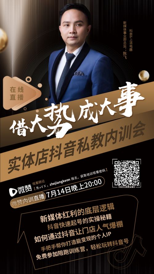 借大势成大事——实体店抖音私教内训会即将开启,7月14日晚8点,科恩&上派电器新媒体事业部总监陈飞先生,邀您免费参加陪跑训练营,轻松玩转抖音号,干货满满,不容错过!