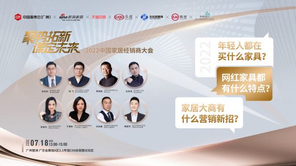 7月18日13:00-15:00,广交会展馆A区2.1号馆C06经英圈论坛区,中国家博会(广州)携手新浪家居共同举办“聚势拓新,谋定未来:2022中国家居经销商大会”,拟将邀请京东资深高级研究员、协会领导以及全国资深家居大商,剖析当前年轻消费群体的家具选购偏好,以及家居营销的新模式、新形态,助力家居经销商开拓经营新思路、积极把握巿场机遇,共建行业美好未来。