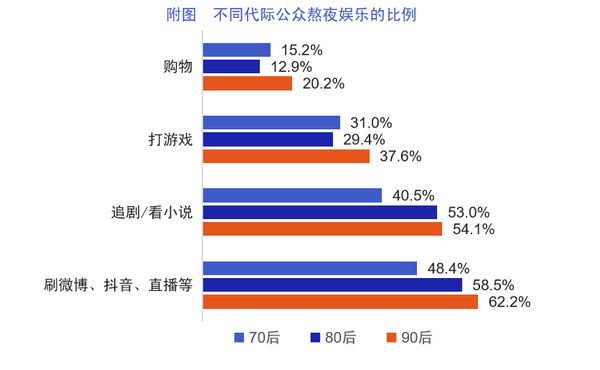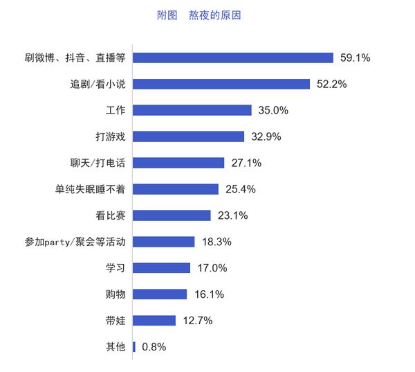 报告由广到细,从面到点的层层拨露了当代国民的睡眠现状。调查显示,一周7天中,公众平均每周熬夜3.6天,只有8.6%的人从不熬夜。熬夜的原因五花八门、形形色色。刷微博、抖音、直播更是以近6成(59.1%)的比例高居榜首,追剧/看小说也以超过半数(52.2%)的比例排在前列。此外,工作也是导致熬夜的“原罪”,35%的人因为工作而熬夜;其中高职位、高收入水平群体熬夜问题尤其突出;广告公关行业从业者睡眠质量最差,比例高达36.6%。因学习而熬夜的也占比17%。值得一提的是,年轻人格外能熬,90后人群熬夜工作和熬夜娱乐的情况都比80后和70后更严重,堪称熬夜“课代表”。