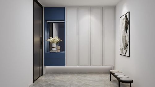 充满现代轻奢调性的玄关,通过大面积的白色应用,更显空间宽阔,收纳效果与视觉精致高度契合,带有木质纹理的穿鞋凳与现代风格装饰画,让入户的第一视觉就能读懂户主的生活方式。