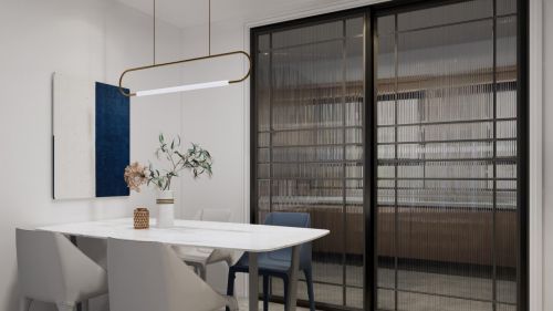 大面积茶白色混油应用,搭配白色格栅板与造型板,点缀蝶翅蓝,优雅中透着静匿。