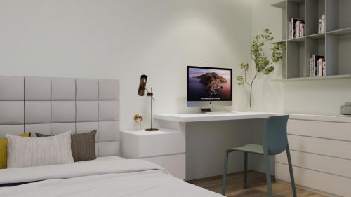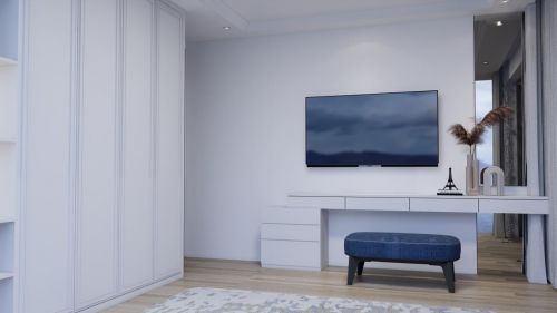 白色墙面与柜面,搭配奶油色家具,让人不由自主的关注到优雅的调性与细节。考虑到家居储物的柜体应用,在融合空间美感的同事,更有效的完成了归置与收纳效果。在软装搭配上,一个带有蝶翅蓝的妆凳,就能通过色彩的混杂与明暗的调节,带来无限惊喜感。