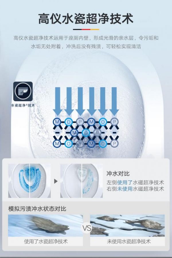 德国高仪智能马桶标配技术高仪顺滑内壁技术、高仪抑菌表面技术、高仪离子除菌技术、高仪水瓷超净技术、高仪双漩劲冲技术等等都同时搭载在这款高仪艾吉娜智能座厕中。