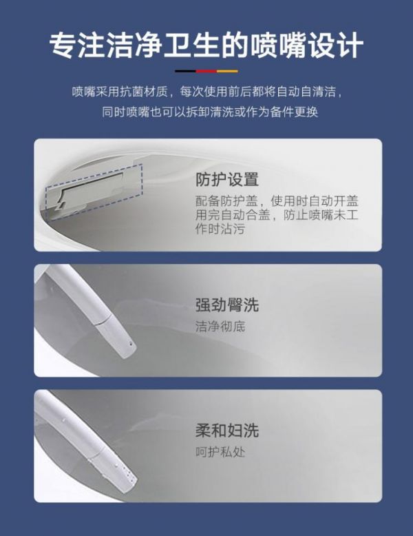 这款德国高仪智能马桶搭载的是双洗臂喷嘴,臀洗+妇洗是分开独立的喷嘴。喷嘴可替换且带有自洁功能,用起来方便又干净,且都具有独立的日常喷嘴防护罩,不使用此功能的时候,高仪智能马桶都安全抑菌防护喷嘴。