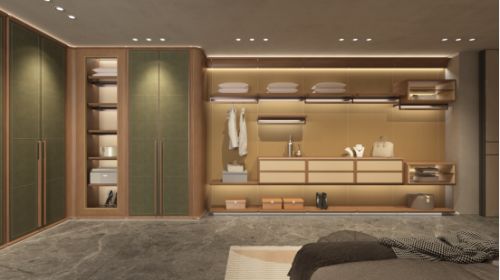 在功能性研发上,喜盈门充分考虑当代家庭对收纳的多样性需求,对于不同种类的物件,采用不同的收纳空间进行放置,以充满美学的排列组合,有效利用空间,更考虑到日常生活的便利性。通过对合理的规划,释放空间尺度,将颜值与内涵融合为一,将灯光融入衣柜之中,凸显奢雅品质,高级感浑然天成,RICCI长青系列衣帽间完美定义衣柜收纳系统。