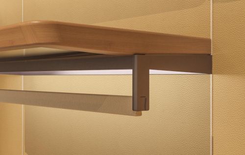 衣杆是整个悬挂系统的重要组成部分,设计灵感源自银锭榫,衣杆通体采用扪皮工艺,与两端堵头契合,在满足使用功能的同时,造型上也是对中国传统榫卯工艺的一种致敬。