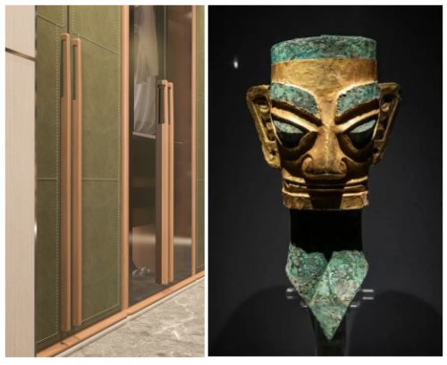 RICCI长青系列衣帽间系列拉手风格源于三星堆出土面具,充满拉手侧面与面具窗笼形态相似,且与 RICCI 首字母‘R’不谋而合。