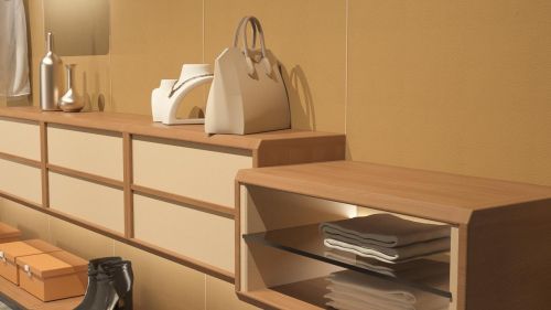 在材料的应用中,RICCI长青系列衣帽间采用天然木材与玻璃、金属的多重组合,背板激光雕刻绒布工艺,运用多材质融合设计手法,增添别样美感,在柜体结合中国传统家具的线条与元素,独造符合现代空间尺度的衣橱间。