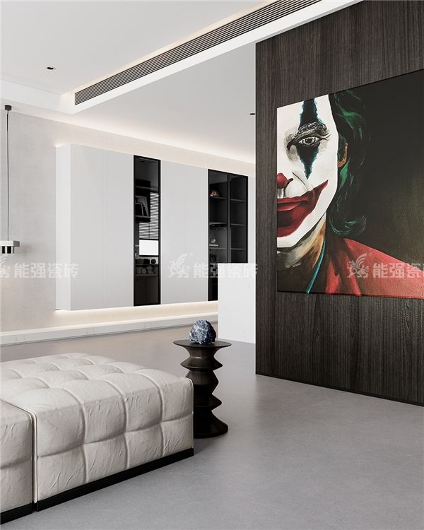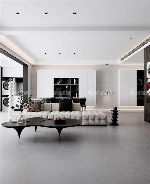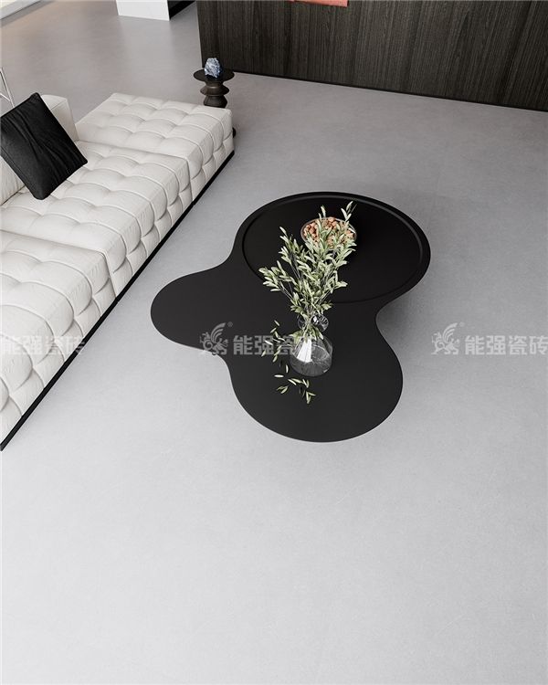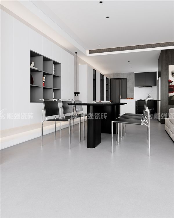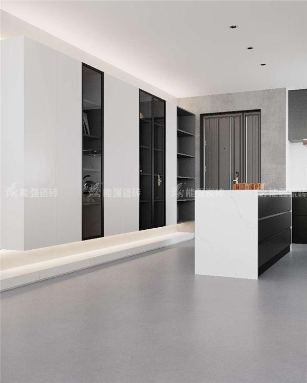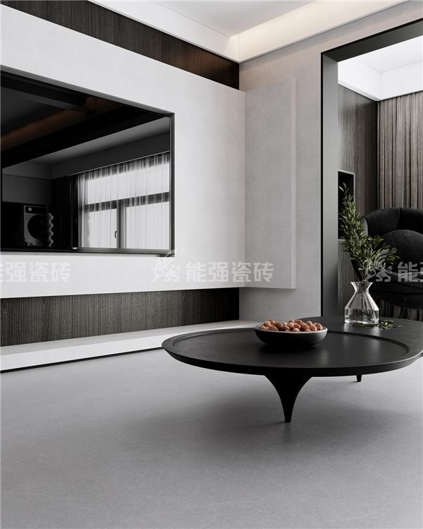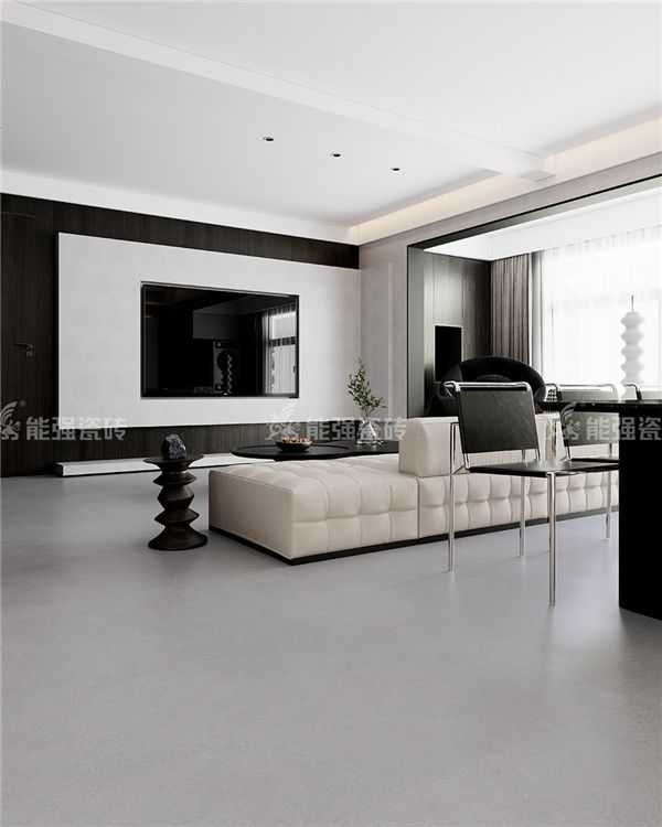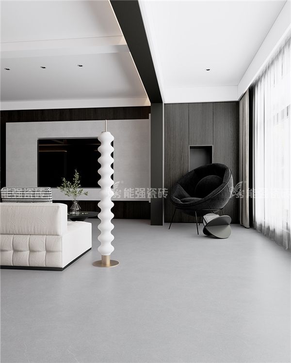 根据业主的需求,去除一切繁复的东西,以黑白灰为主色调,地砖采用灰色调的能强素岩·法兰绒NY715173GC慕斯灰全屋通铺,黑色软装辅以搭配,整体清爽干练,优雅大气。