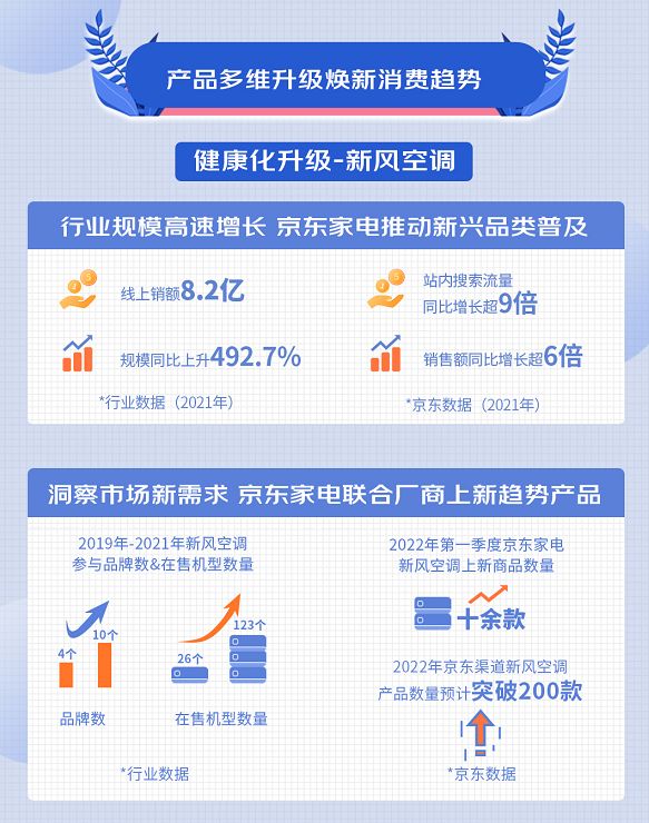 据京东家电联合奥维云网发布的《2022空调行业趋势报告》显示,2021年新风空调线上销售额8.2亿元,规模同比上升492.7%。京东家电2021年站内新风空调搜索流量同比增长超9倍,成交额同比增长超6倍。仅2022年第一季度京东家电新风空调上新十余款,2022年京东新风空调产品数量预计突破200款,足见此类消费需求的快速增长。