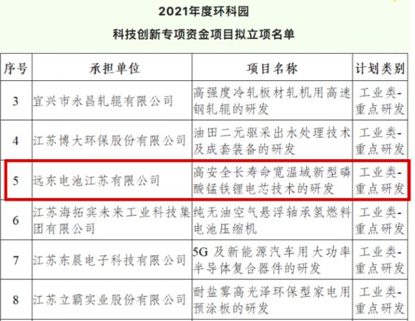 日前,中国宜兴环保科技工业园管理委员会对外公布2021年度宜兴市科技创新专项资金项目名单,远东智慧能源股份有限公司(简称:远东股份,股票代码:600869)旗下远东电池江苏有限公司主导的“高安全长寿命宽温域新型磷酸锰铁锂电芯技术的研发”项目顺利入围。